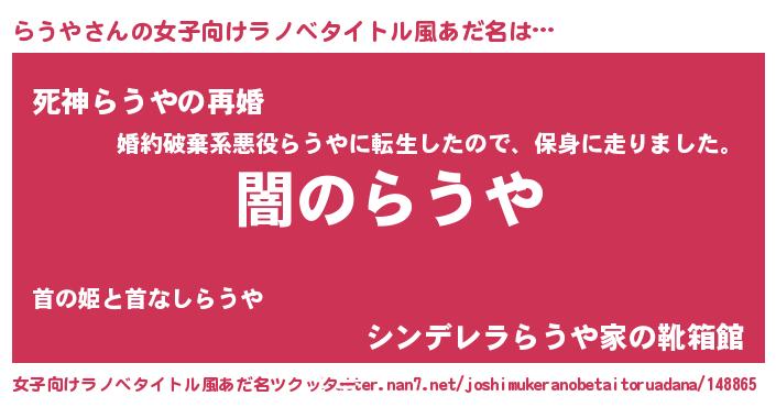 | 男性向けラノベタイトル風あだ名 | 『Re:らうやから始める異世界生活』 |