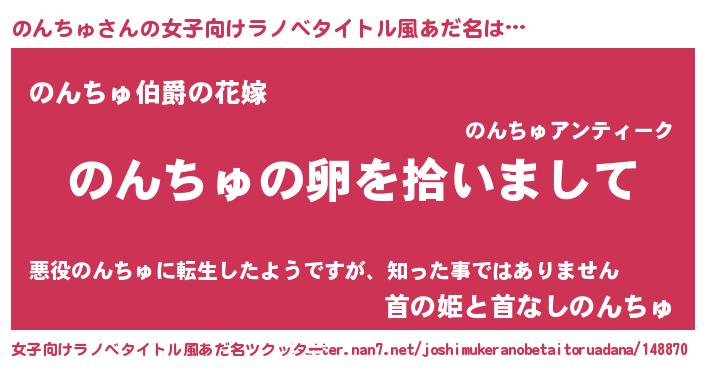 | 男性向けラノベタイトル風あだ名 | 『ダンジョンにのんちゅを求めるのは間違っているだろうか』 |