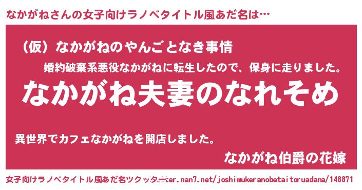 | 男性向けラノベタイトル風あだ名 | 『おまえをオタクにしてやるから、俺をなかがねにしてくれ! 』 |