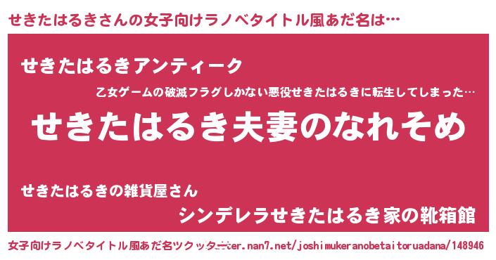 | 男性向けラノベタイトル風あだ名 | 『おまえをオタクにしてやるから、俺をせきたはるきにしてくれ! 』 |