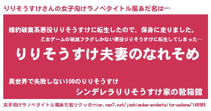 | 男性向けラノベタイトル風あだ名 | 『おまえをオタクにしてやるから、俺をりりそうすけにしてくれ! 』 |