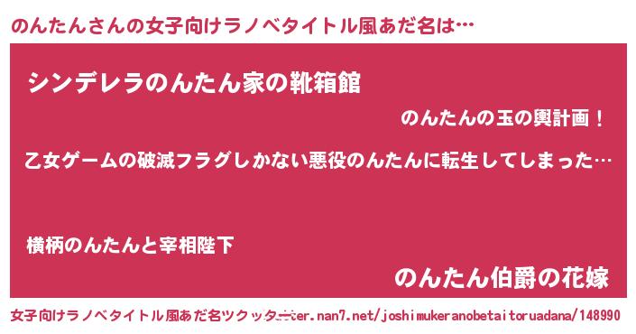 | 男性向けラノベタイトル風あだ名 | 『魔弾の王とのんたん』 |
