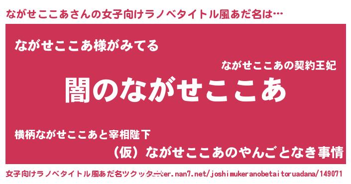 | 男性向けラノベタイトル風あだ名 | 『Re:ながせここあから始める異世界生活』 |