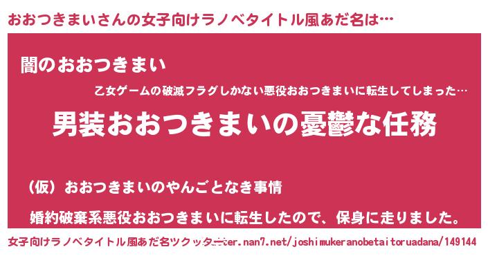 | 男性向けラノベタイトル風あだ名 | 『うちのおおつきまいが世界を掌握している!』 |
