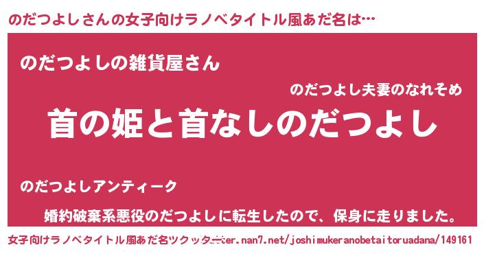 のだつよしさんの女子向けラノベタイトル風あだ名は… 『首の姫と首なしのだつよし』『のだつよしの雑貨屋さん』『婚約破棄系悪役のだつよしに転生したので、保身に走りました。』 ツクッター #女子向けラノベタイトル風あだ名ツクッター http://tkutter.nan7.net/joshimukeranobetaitoruadana/149161/