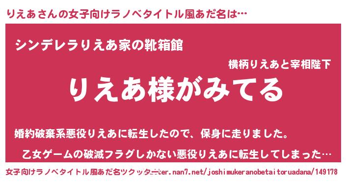 | 男性向けラノベタイトル風あだ名 | 『りえあの嫁は女の子じゃないと思った?』 |