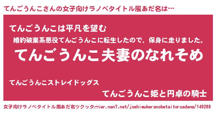 てんごうんこさんの女子向けラノベタイトル風あだ名は… 『てんごうんこ夫妻のなれそめ』『てんごうんこは平凡を望む』『てんごうんこ姫と円卓の騎士』 ツクッター #女子向けラノベタイトル風あだ名ツクッター http://tkutter.nan7.net/joshimukeranobetaitoruadana/149288/