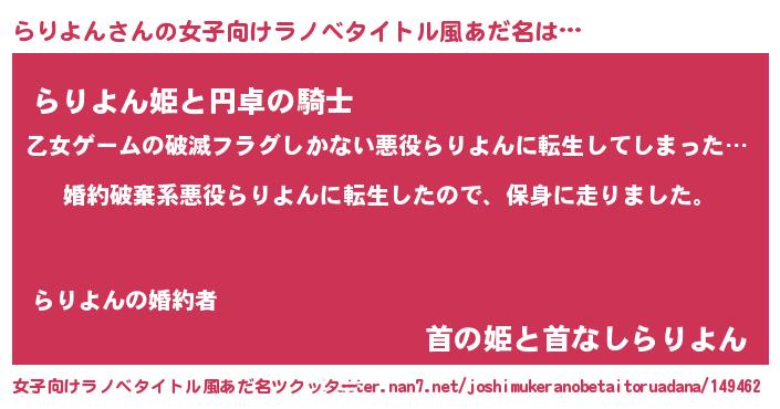 | 男性向けラノベタイトル風あだ名 | 『ラリヨンスレイヤー』『らりよんの憂鬱』 |