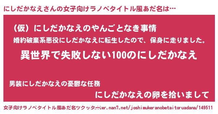 | 男性向けラノベタイトル風あだ名 | 『にしだかなえという概念が存在しない退屈な世界 』 |