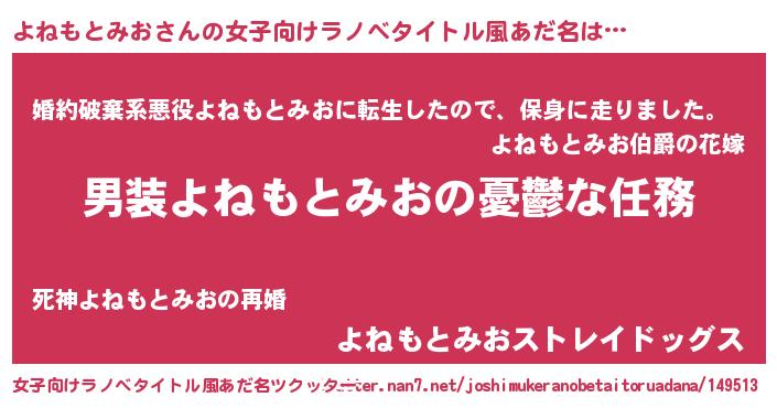 | 男性向けラノベタイトル風あだ名 | 『うちのよねもとみおが世界を掌握している!』 |