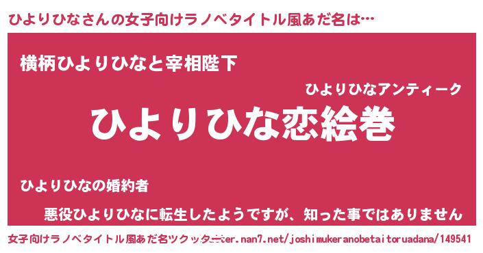 | 男性向けラノベタイトル風あだ名 | 『おまえをオタクにしてやるから、俺をひよりひなにしてくれ! 』 |