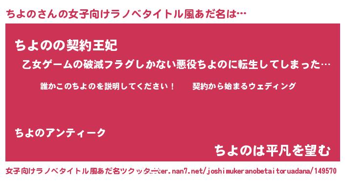 | 男性向けラノベタイトル風あだ名 | 『チヨノアートオンライン』 |