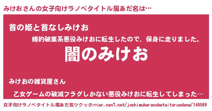 みけおさんの女子向けラノベタイトル風あだ名は… 『闇のみけお』『首の姫と首なしみけお』『乙女ゲームの破滅フラグしかない悪役みけおに転生してしまった…』 ツクッター #女子向けラノベタイトル風あだ名ツクッター http://tkutter.nan7.net/joshimukeranobetaitoruadana/149589/