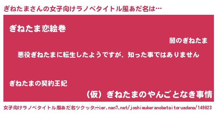| 男性向けラノベタイトル風あだ名 | 『この素晴らしい世界にぎねたまを!』 |