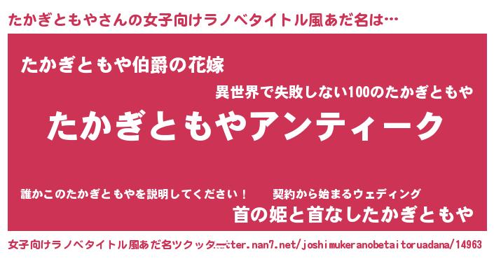 | 男性向けラノベタイトル風あだ名 | 『魔法科高校のたかぎともや』 |