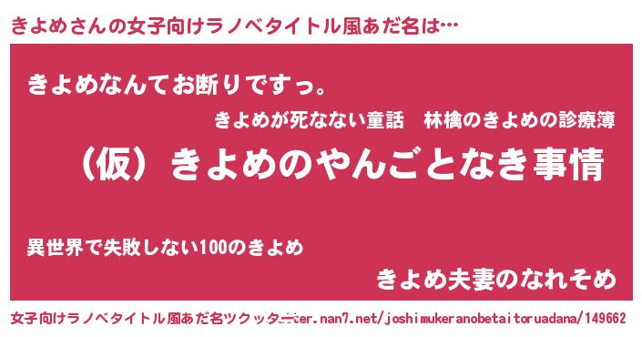 きよめさんの女子向けラノベタイトル風あだ名は… 『(仮)きよめのやんごとなき事情』『きよめなんてお断りですっ。』『きよめ夫妻のなれそめ』 ツクッター #女子向けラノベタイトル風あだ名ツクッター http://tkutter.nan7.net/joshimukeranobetaitoruadana/149662/