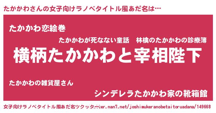 | 男性向けラノベタイトル風あだ名 | 『たかかわに滅ぼされるだけの簡単なお仕事です』 |