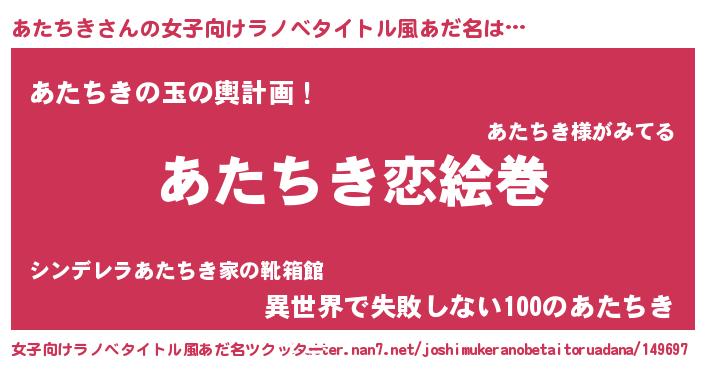 | 男性向けラノベタイトル風あだ名 | 『おまえをオタクにしてやるから、俺をあたちきにしてくれ! 』 |