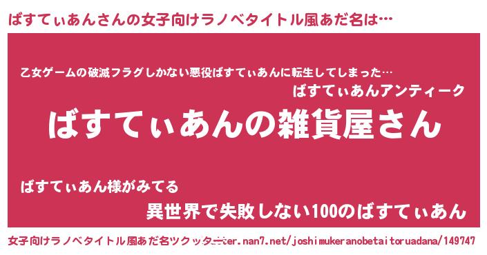 | 男性向けラノベタイトル風あだ名 | 『やはりばすてぃあんの青春ラブコメはまちがっている 』 |
