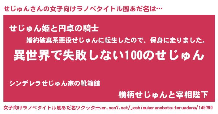 せじゅんさんの女子向けラノベタイトル風あだ名は… 『異世界で失敗しない100のせじゅん』『せじゅん姫と円卓の騎士』『横柄せじゅんと宰相陛下』 ツクッター #女子向けラノベタイトル風あだ名ツクッター http://tkutter.nan7.net/joshimukeranobetaitoruadana/149790/