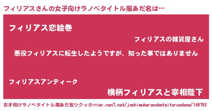 | 男性向けラノベタイトル風あだ名 | 『この素晴らしい世界にフィリアスを!』 |