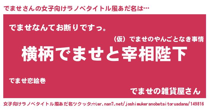 | 男性向けラノベタイトル風あだ名 | 『でませに滅ぼされるだけの簡単なお仕事です』 |