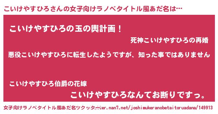 | 男性向けラノベタイトル風あだ名 | 『この素晴らしい世界にこいけやすひろを!』 |