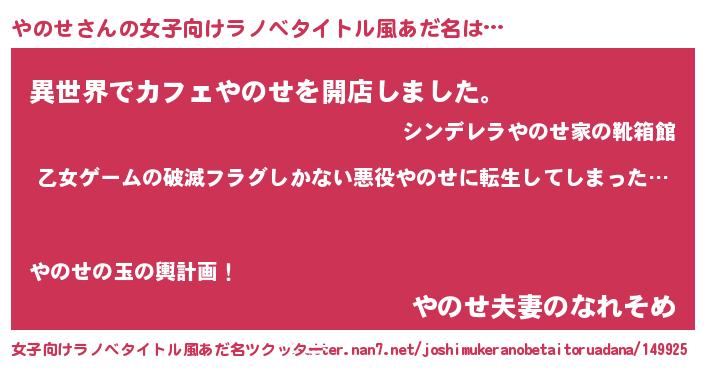 | 男性向けラノベタイトル風あだ名 | 『この素晴らしい世界にやのせを!』 |