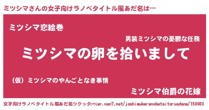 | 男性向けラノベタイトル風あだ名 | 『ミツシマの嫁は女の子じゃないと思った?』 |