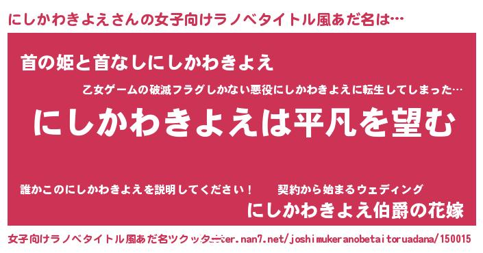 | 胡散臭い通販商品みたいなあだ名 | 『信頼と実績のサプリメント…その名も「にしかわきよえ」』 |