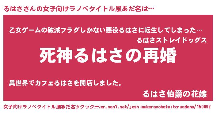 るはささんの女子向けラノベタイトル風あだ名は… 『死神るはさの再婚』『乙女ゲームの破滅フラグしかない悪役るはさに転生してしまった…』『るはさ伯爵の花嫁』 ツクッター #女子向けラノベタイトル風あだ名ツクッター http://tkutter.nan7.net/joshimukeranobetaitoruadana/150092/