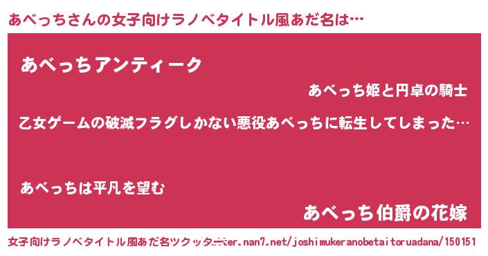 | 男性向けラノベタイトル風あだ名 | 『この素晴らしい世界にあべっちを!』 |