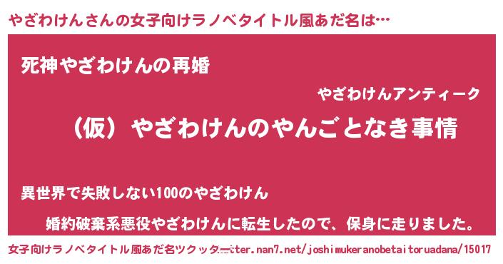 | 男性向けラノベタイトル風あだ名 | 『やざわけんの憂鬱』 |