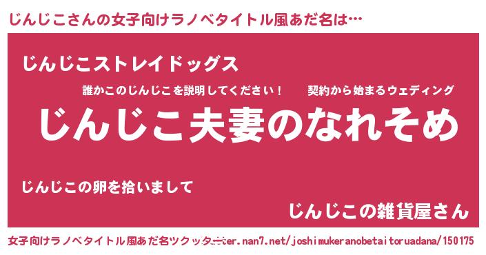 | 男性向けラノベタイトル風あだ名 | 『おまえをオタクにしてやるから、俺をじんじこにしてくれ! 』 |