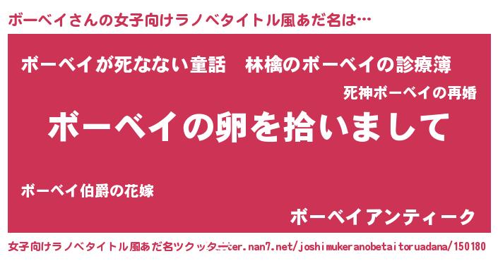 | 男性向けラノベタイトル風あだ名 | 『ダンジョンにボーベイを求めるのは間違っているだろうか』 |