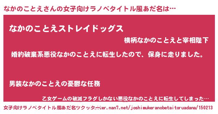 なかのことえさんの女子向けラノベタイトル風あだ名は… 『婚約破棄系悪役なかのことえに転生したので、保身に走りました。』『なかのことえストレイドッグス』『乙女ゲームの破滅フラグしかない悪役なかのことえに転生してしまった…』 ツクッター #女子向けラノベタイトル風あだ名ツクッター http://tkutter.nan7.net/joshimukeranobetaitoruadana/150213/