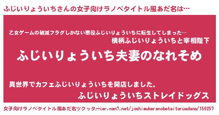 | 男性向けラノベタイトル風あだ名 | 『おまえをオタクにしてやるから、俺をふじいりょういちにしてくれ! 』 |