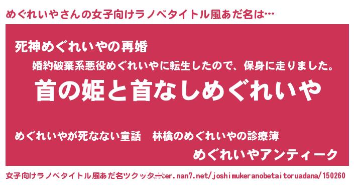 | 男性向けラノベタイトル風あだ名 | 『はたらくめぐれいやさま!』 |