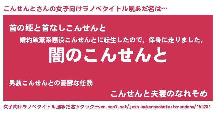 | 男性向けラノベタイトル風あだ名 | 『Re:こんせんとから始める異世界生活』 |