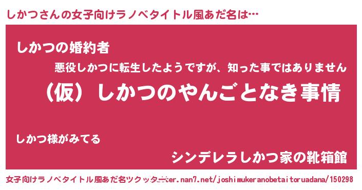 しかつさんの女子向けラノベタイトル風あだ名は… 『(仮)しかつのやんごとなき事情』『しかつの婚約者』『シンデレラしかつ家の靴箱館』 ツクッター #女子向けラノベタイトル風あだ名ツクッター http://tkutter.nan7.net/joshimukeranobetaitoruadana/150298/