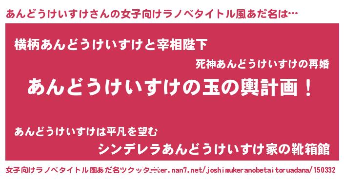 | 男性向けラノベタイトル風あだ名 | 『あんどうけいすけ~年齢イコール彼女いない歴の魔法使い~』 |