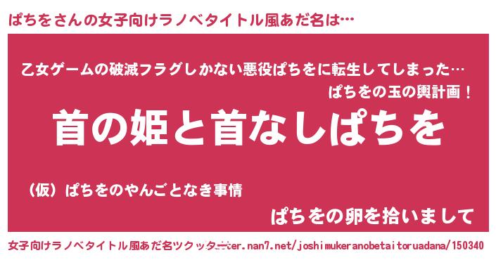 | 男性向けラノベタイトル風あだ名 | 『はたらくぱちをさま!』『ぱちをの憂鬱』 |