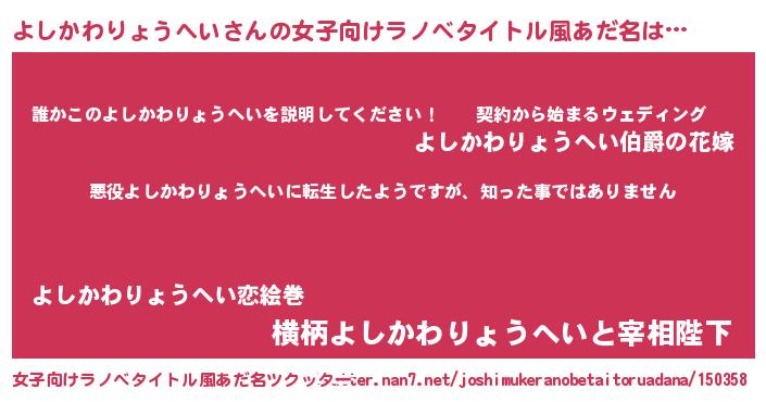 | 胡散臭い通販商品みたいなあだ名 | 『あなたにだけ特別に提供する100年もののヴィンテージワイン…その名も「よしかわりょうへい」』 |