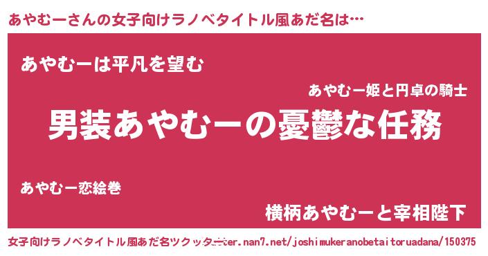 | 男性向けラノベタイトル風あだ名 | 『うちのあやむーが世界を掌握している!』 |