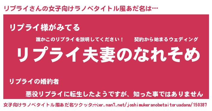 | 男性向けラノベタイトル風あだ名 | 『おまえをオタクにしてやるから、俺をリプライにしてくれ! 』 |