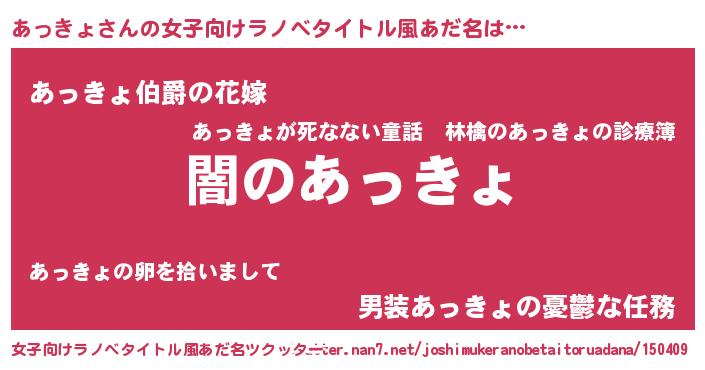 | 男性向けラノベタイトル風あだ名 | 『Re:あっきょから始める異世界生活』 |