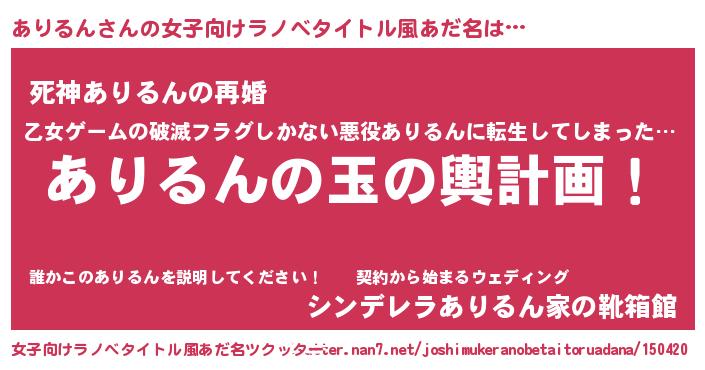 | 男性向けラノベタイトル風あだ名 | 『ありるん~年齢イコール彼女いない歴の魔法使い~』 |