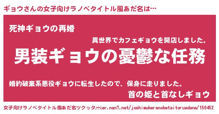 | 男性向けラノベタイトル風あだ名 | 『うちのギョウが世界を掌握している!』 |