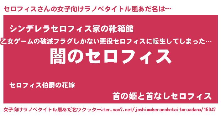 | 男性向けラノベタイトル風あだ名 | 『Re:セロフィスから始める異世界生活』 |