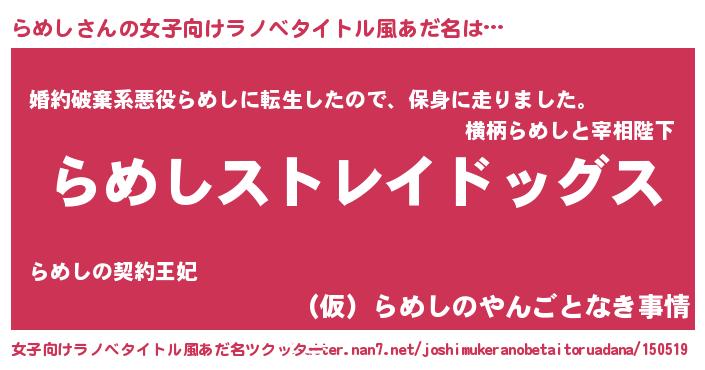 | 男性向けラノベタイトル風あだ名 | 『Re:らめしから始める異世界生活』 |